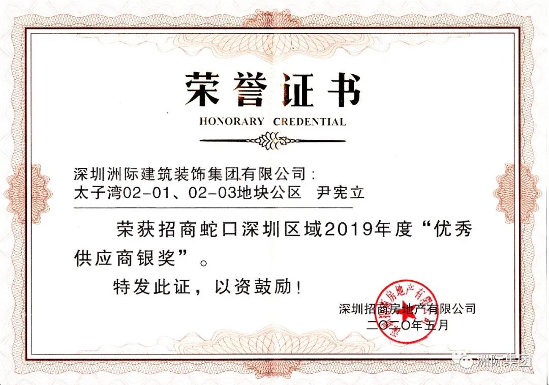 近日,深圳洲際建筑裝飾集團有限公司(以下稱“洲際裝飾集團”)榮獲招商地產 “深圳區域2019年度優秀供應商銀獎”。