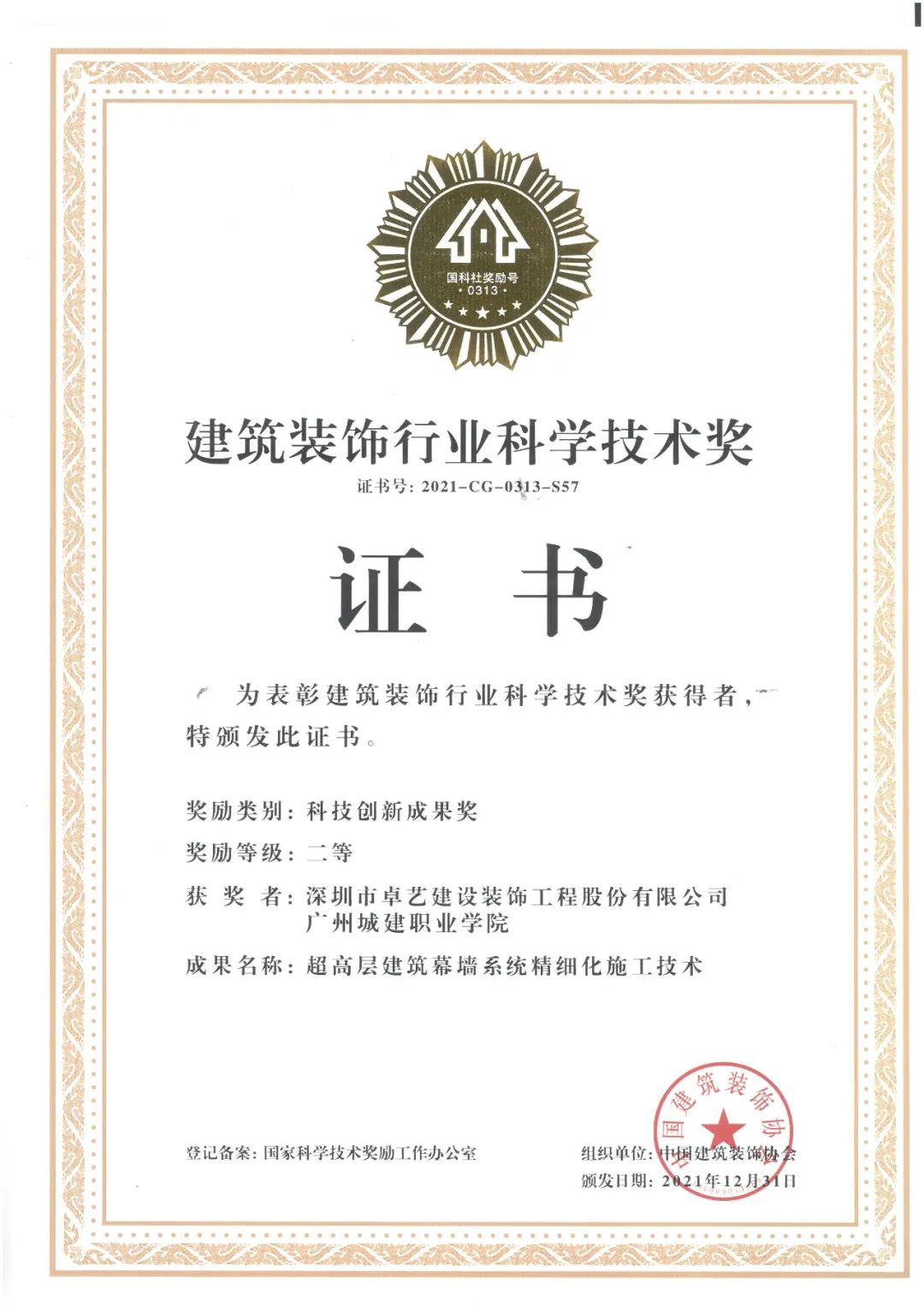 近期,“2021-2022年度中國建筑裝飾行業(yè)科學(xué)技術(shù)獎”和“2021-2022年度中國建筑工程裝飾獎”頒獎典禮在京隆重舉行,卓藝裝飾收獲頗豐,再添6項國家級獎項,包含1項“建筑裝飾行業(yè)科學(xué)技術(shù)獎”和5項“中國建筑工程裝飾獎”。