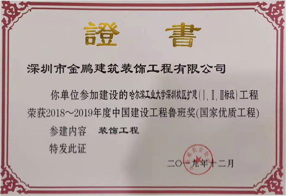在頒獎儀式上,金鵬裝飾參建的哈爾濱工業大學深圳校區項目榮獲“中國建設工程魯班獎”,該項目是金鵬裝飾首個魯班獎項目,也是公司多年來實施精品戰略取得的新成果,充分彰顯了公司在工程建設領域所具備的實力和品牌影響力,填補了金鵬建筑裝飾魯班獎的空白,為企業發展藍圖中灑下濃墨重彩的一筆。