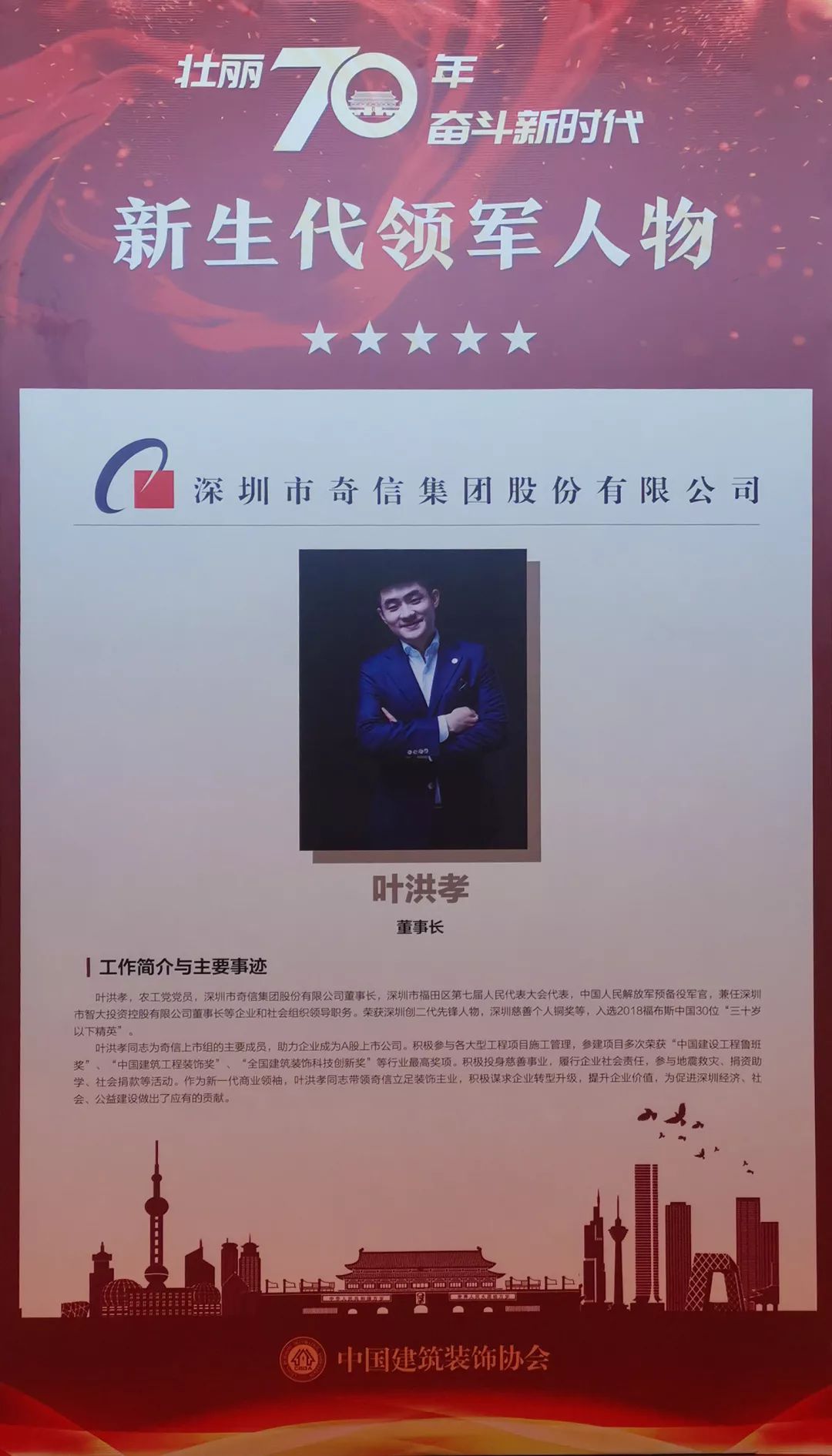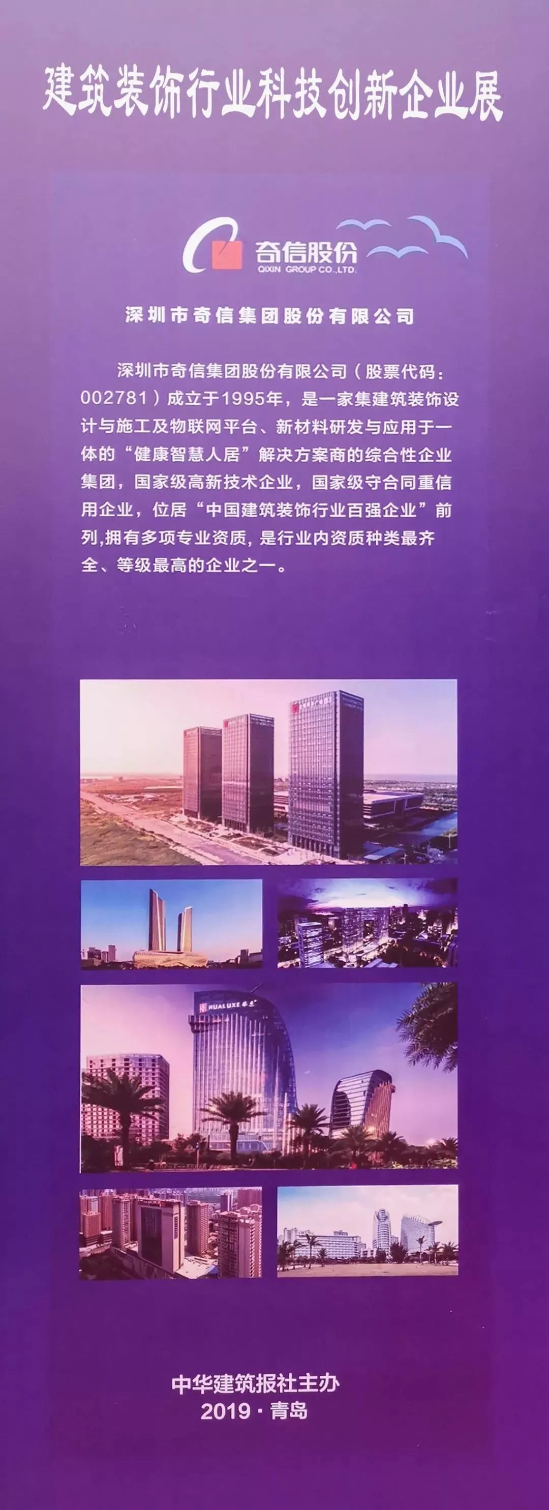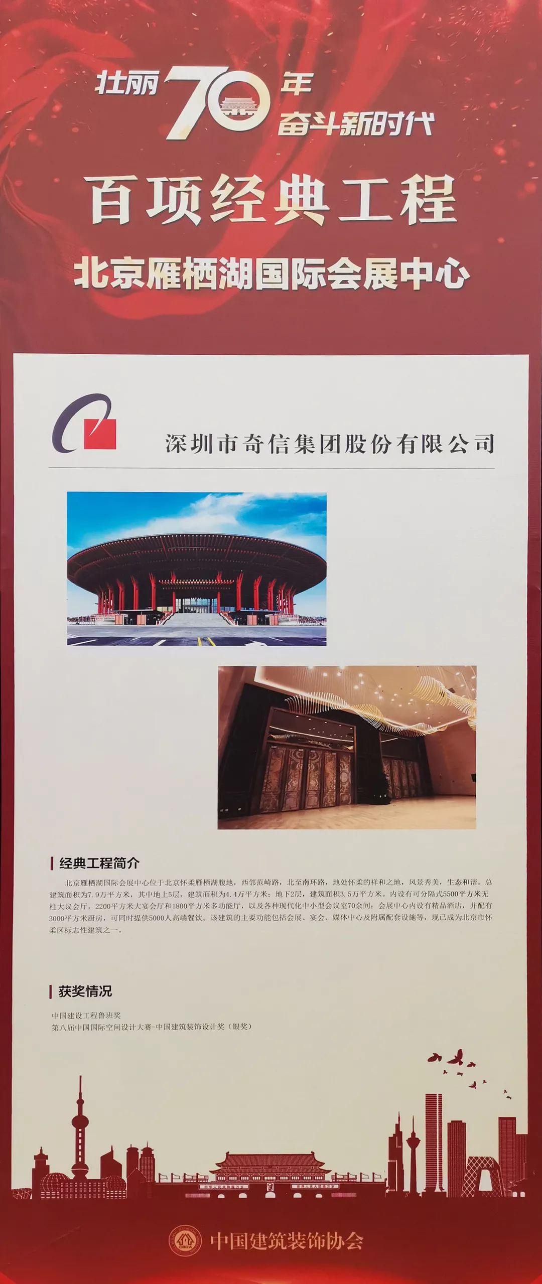 2019年11月28日-29日,第四屆全國(guó)建筑裝飾行業(yè)科技創(chuàng)新大會(huì)暨大國(guó)裝飾70年輝煌成就展在青島國(guó)際會(huì)議中心隆重召開(kāi)。會(huì)上,深圳市奇信建設(shè)集團(tuán)股份有限公司(以下稱(chēng)“奇信股份”)被授予“科技創(chuàng)新企業(yè)”稱(chēng)號(hào),其承建的項(xiàng)目北京雁棲湖國(guó)際會(huì)展中心獲得“70周年百項(xiàng)經(jīng)典工程”稱(chēng)號(hào),奇信股份董事長(zhǎng)葉洪孝榮獲“新生代領(lǐng)軍人物“稱(chēng)號(hào)。