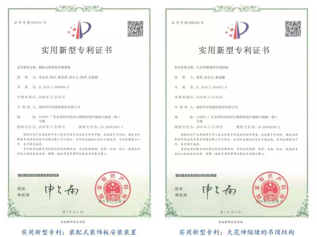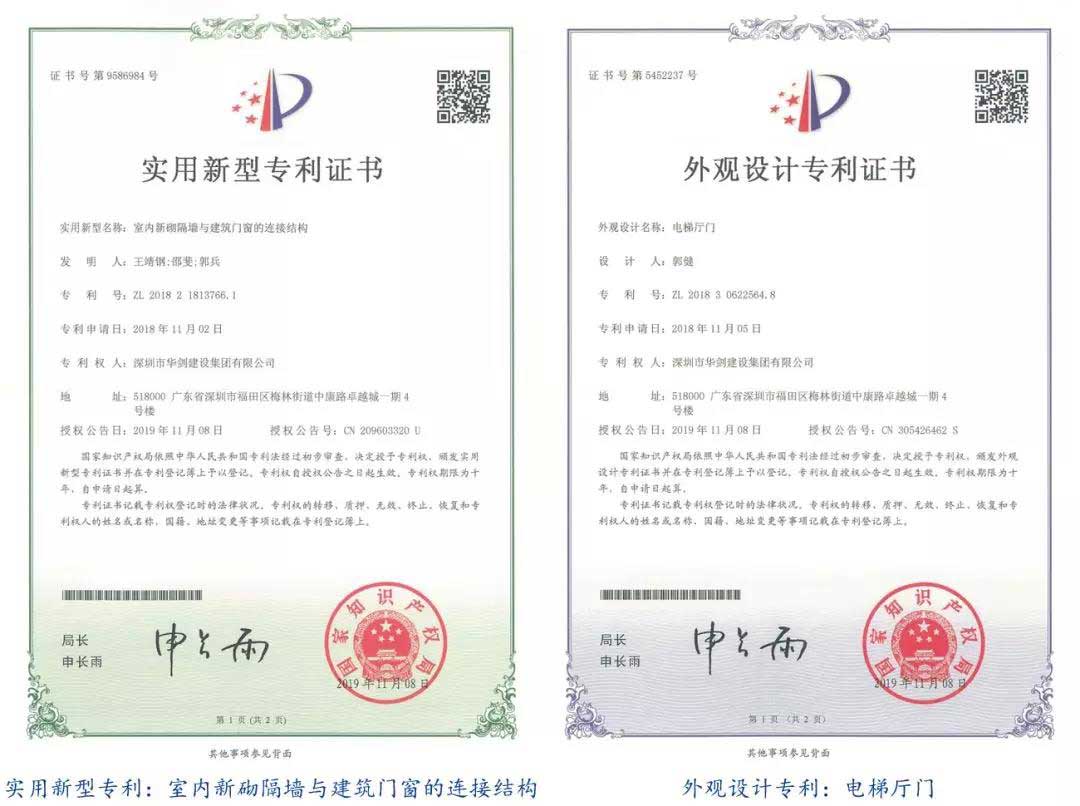 近日,深圳市華劍建設集團股份有限公司(以下稱“華劍股份”)新增國家知識產權局頒發的4份專利證書,其中3項為實用新型專利,1項為外觀設計專利。