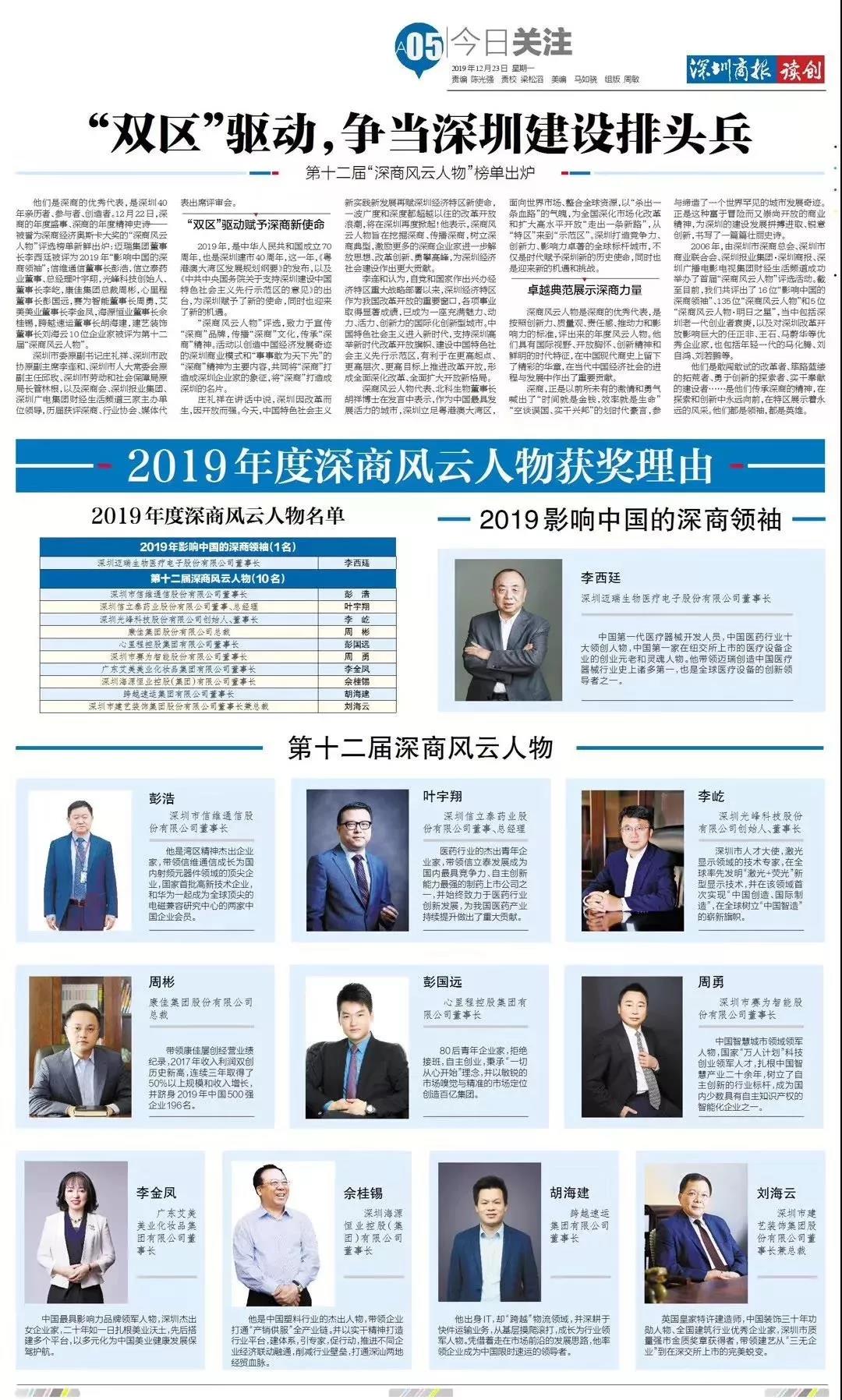 據悉,“深商風云人物”評選評選活動創辦于2006年,旨在宣傳“深商”品牌,傳播“深商”文化,傳承“深商”精神。活動以創造中國經濟發展奇跡的深圳商業模式和“事事敢為天下先”的“深商”精神為主要內容,共同將“深商”打造成深圳企業家的象征,將“深商”打造成深圳的名片。 按照創新力、質量觀、責任感、推動力和影響力的標準,最終有十位企業家通過評審,成功入選本屆“深商風云人物”榜單。